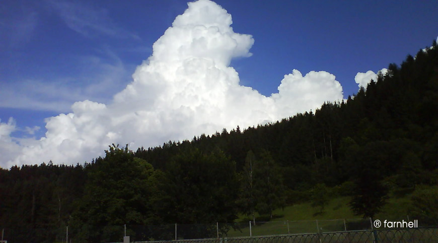 die Großeltern der Prinzen in unserem kleinen Gebirgstal kamen aus Monaco mit ihrem riesigen Chevrolet angerauscht und ein kleiner Hund war dabei, der mich an dieses Foto erinnert. Exakt gleich weiß und ebenso passend die Kopfform. Faszinierend, wie Wolken oftmals Formen von Lebewesen annehmen und es könnte sich tatsächlich um ein Porträt der fürstlichen Pudeldame von damals handeln. Was mir noch gefällt: das satte Blau als Hintergrund und vorne das dunkle Grün des Waldes, auf dem die Wolke zu ruhen scheint ...