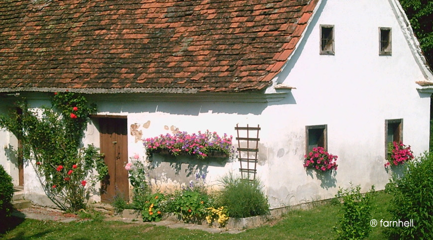 heute dient das alte Bauernhaus als Lagerstätte für Wein und Most. Auch ein Traktor und ein Pflug stehen im kühlen Inneren und in einem Extra-Raum lagern jede Menge Äpfel. Sie sind in ihrer Art wie das Haus selbst: nicht zu groß, saftig und rotbackig wie die Bäuerin. Hinter dem Haus mit den dicken Mauern steht eine alte Bank, da sitzt der Opa gern und pafft an seiner Pfeife, blickt versonnen in die Gegend und denkt wahrscheinlich an frühere Zeiten. Auch Kinder sieht man dann und wann im alten Bauernhaus spielen, wenn der Regen zu Boden klatscht und der eine odere andere Fasan durchnäßt durchs Feld spaziert oder eine Hase durch die Gegend hoppelt ...