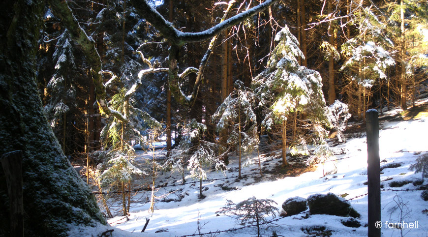 links im Vordergrund der knorrige Alte am Ende seines Lebensweges und vor ihm die jungen Fichten, wie Orgelpfeifen angereiht. Dahinter der Wald in seiner vollen Dichte und den von der Kälte starren Ästen, die so mancher Baum wie zum Schutz von sich zu strecken scheint. Der Stacheldraht - soll uns der womöglich daran hindern, einzutreten in den Wald? Mit ein bisschen Fantasie könnte man sogar in Kindheits-Erinnerungen schwelgen und den Wald zu einem Märchenwald machen. Mit Zwergen und Riesen, Feen und Hexen, Hänsel und Gretel oder Rotkäppchen und dem bösen Wolf ...